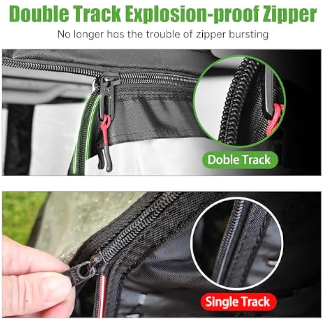 • 【Double Door Zipper & Side Mirror Opening Zipper】This golf cart enclosure with 2 door zippers which ensures easy in and out, doors can be easily rolled up and fixed by velcro. The zippers where on the side mirror is for side mirror opening and installation space.