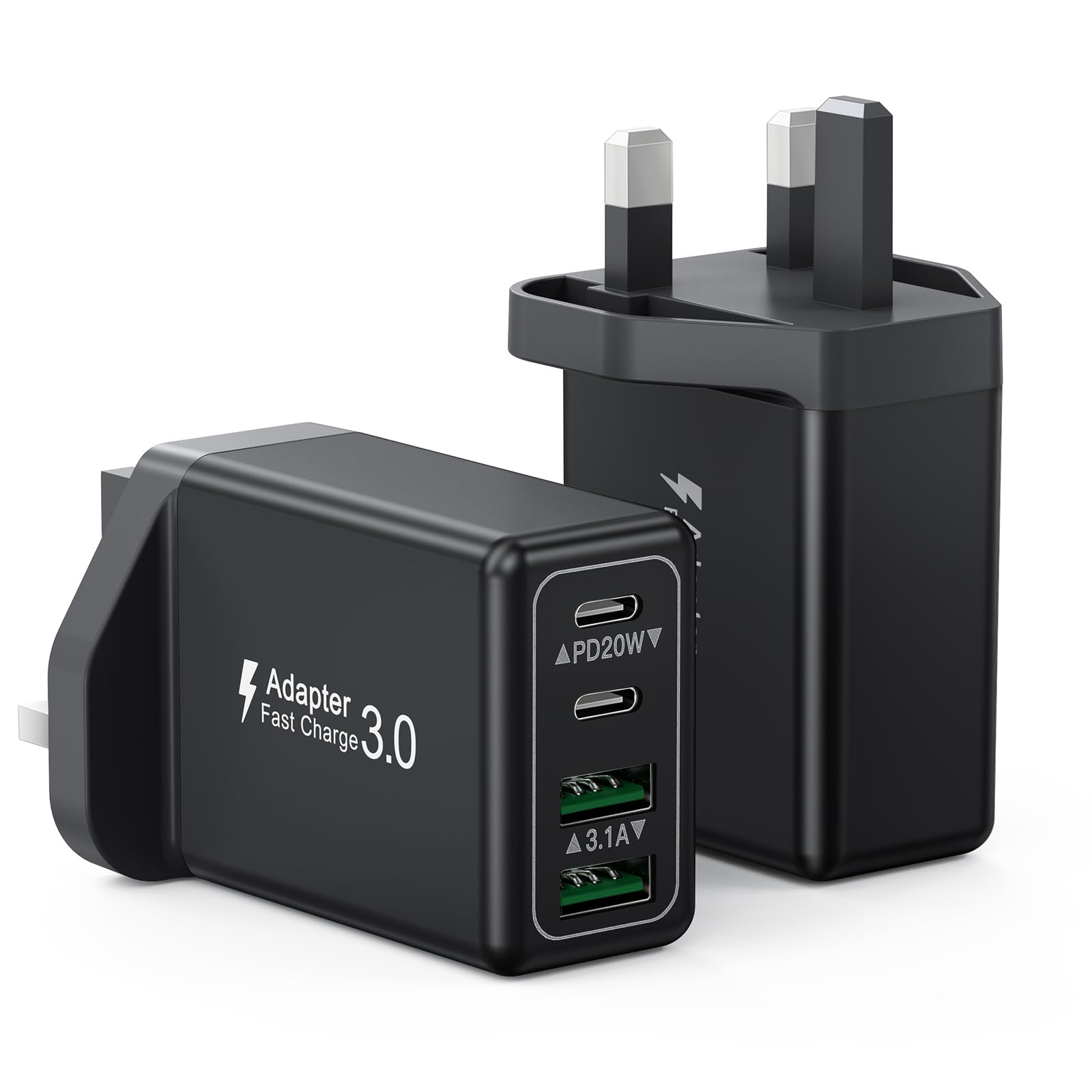 2-Pack USB C Plug, 40W 4-Port USB Charger Plug Fast Charge UK, Dual USBC Power Adapter+ QC USB Wall Plug, Mutil Type C Charging Plug for iPhone 16 15 14 13 12 11 Pro Max Plus, Samsung Charger Head