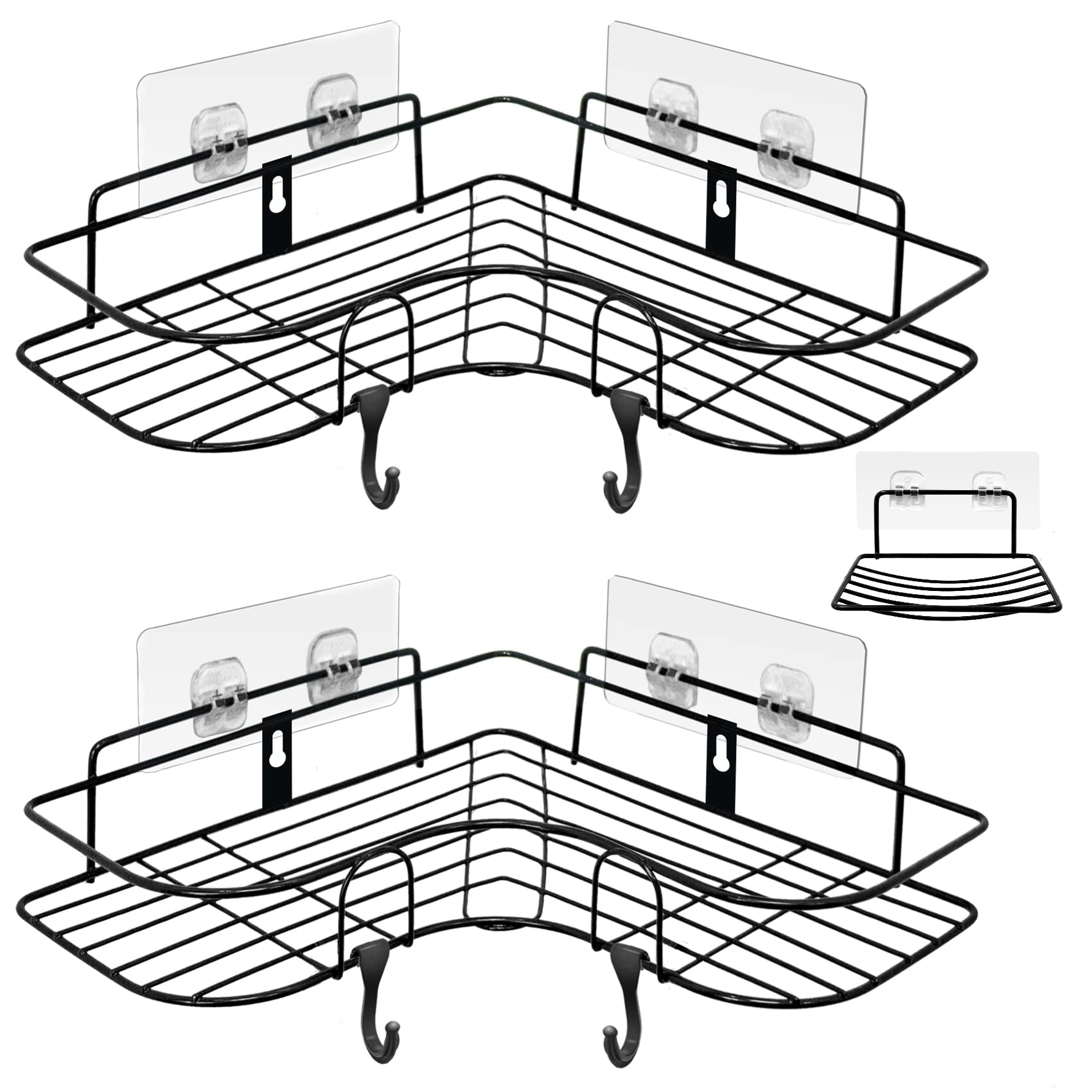 ADORAMOUR Corner Shower Caddy Set -2 Pack Bathroom Organiser with Soap Dish, Adhesive Storage Rack for Toiletries, Shower Shelf Drill-Free or Drilling Install Options Shampoo Holder, Black