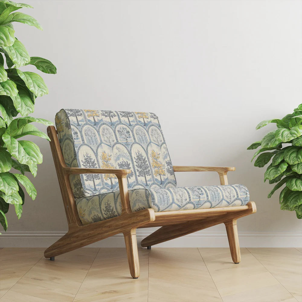 With a gentle palette of ochre yellow, soft blue, and cream, Agra No.5 Upholstery Fabric draws inspiration from the architectural motifs and botanical richness of historic Indian palace gardens. This captivating design features a sequence of domed arches, each framing an intricately drawn tree in bloom — a tribute to craftsmanship and serenity.