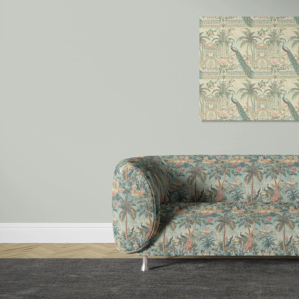 Agra No.8 is a rich and romantic upholstery fabric that draws deeply from the opulence and tranquillity of traditional Indian garden scenes. Featuring ornate palace motifs surrounded by flowering palms, climbing foliage, and serene peacocks, this design captures the spirit of escapist interiors. A wash of soft teal underpins the landscape, with coral and cream highlights bringing warmth and detail to the layered composition.