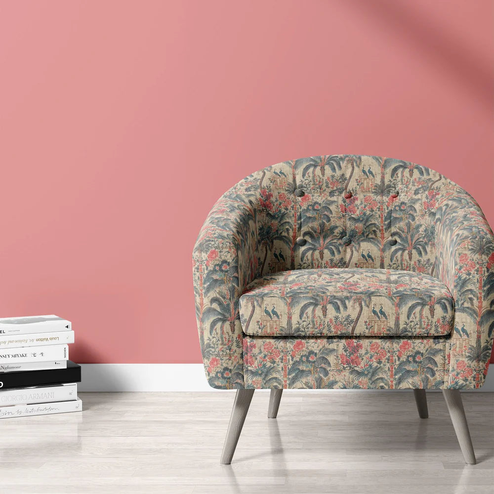 A richly decorative upholstery fabric inspired by Indian garden pavilions, Agra No.9 features detailed floral and botanical scenes in a beautifully weathered palette. Deep teal palm fronds sway alongside coral-red blooms and architectural columns, all intricately arranged across a linen blend basecloth that lends soft texture and durability to this scenic design.