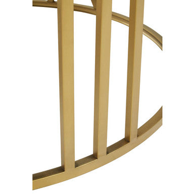 Anchor your lounge with the Alana round coffee table, a bold mix of brushed gold metal and dark tempered glass. The circular top lends a smooth, social shape that encourages easy conversation, while the sculptural frame showcases cutout Roman numerals for a distinctive designer touch.
