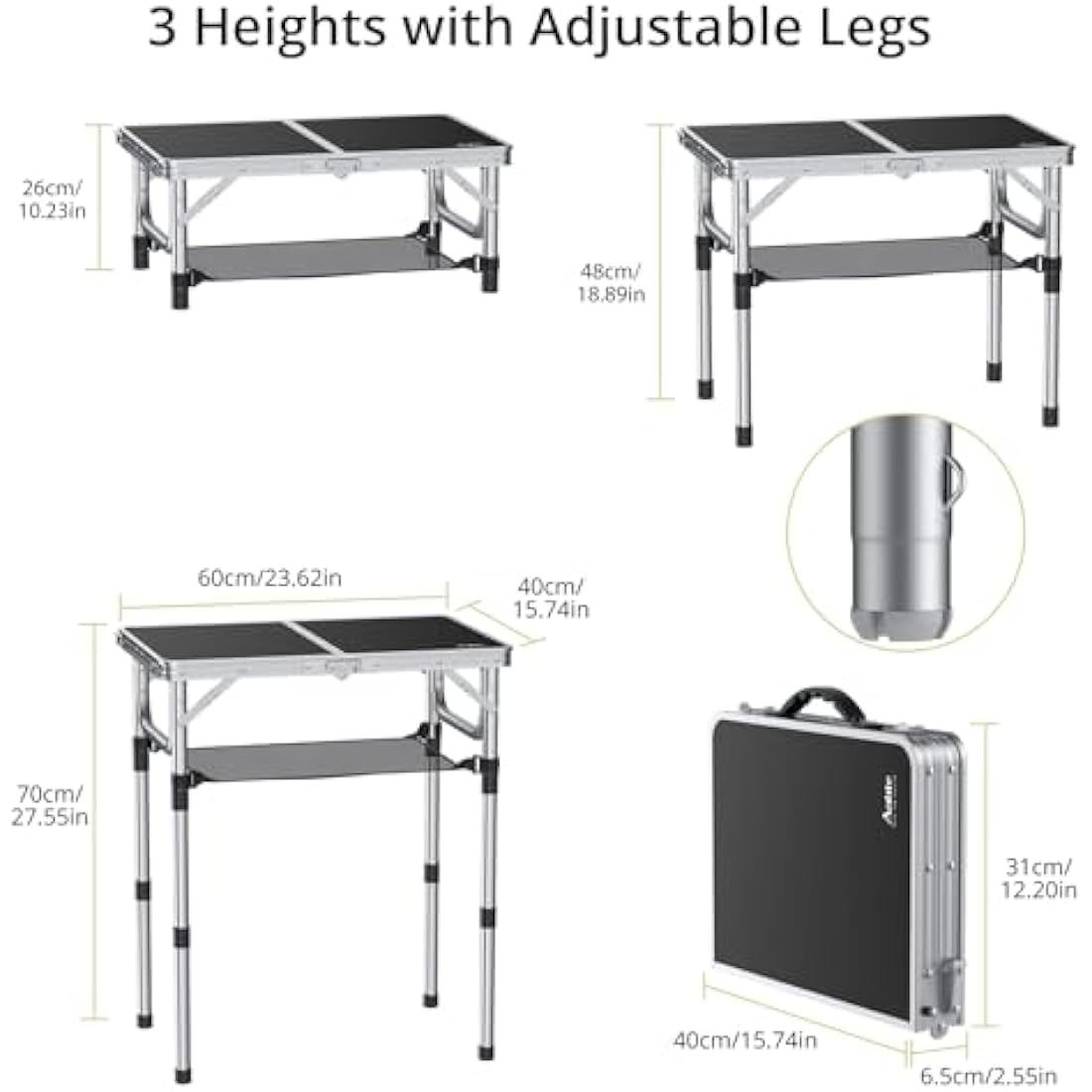 3 Heights Adjustable up to 70cm: There are 3 fixed length for the legs of the table with a height of 26cm, 48 and 70 cm. You can sit on the lawn at the lowest height during a picnic. When adjusted to the highest height, you can also sit on the chair next to the table