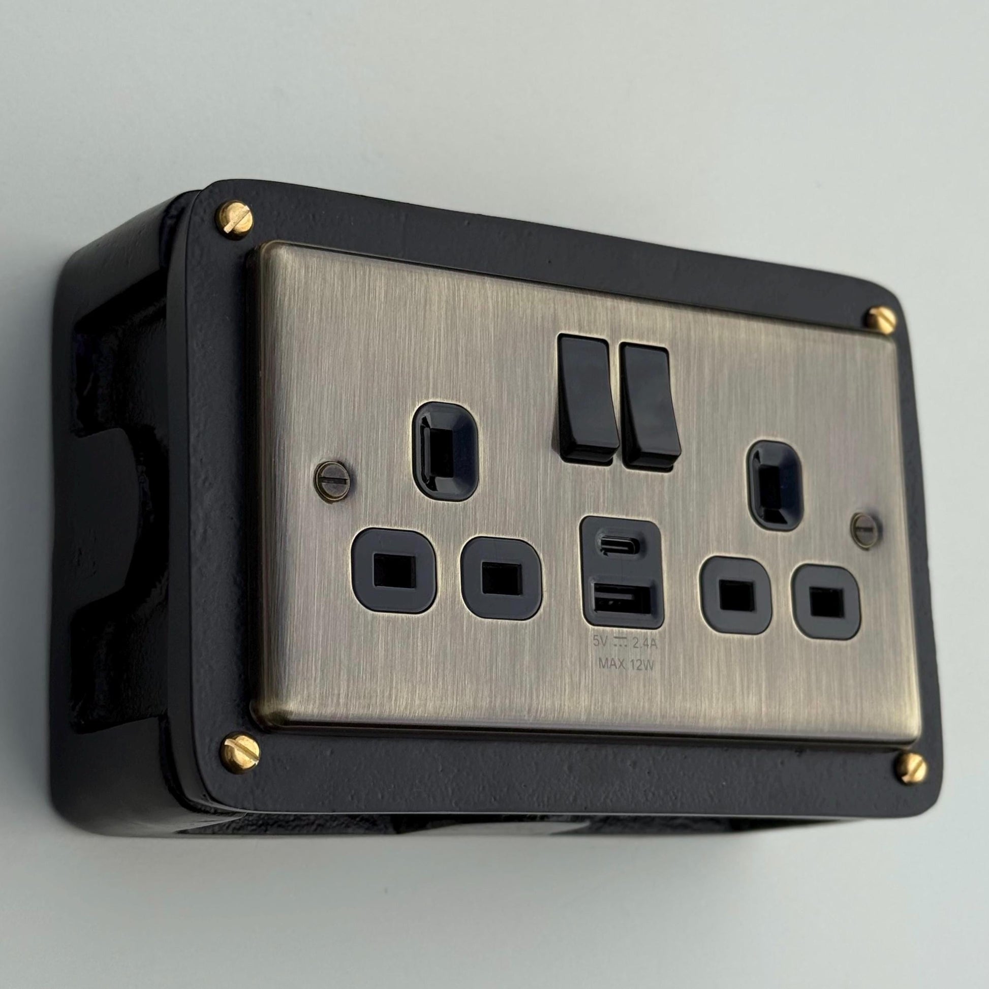 Antique Brass Double Gang Plug Socket with Industrial Black Cast Back Conduit Box