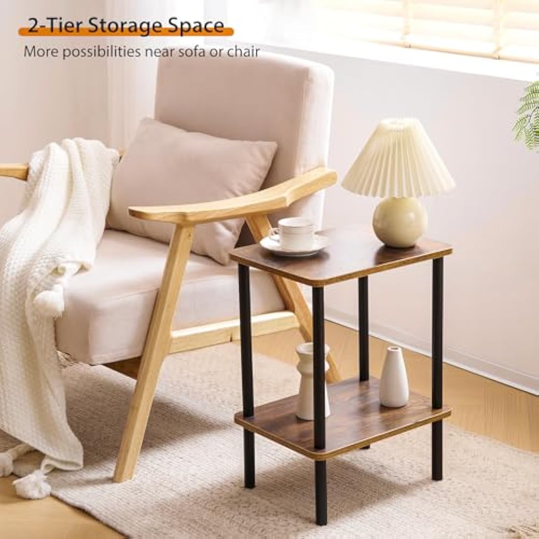 APICIZON 2 Tier Side Table, Narrow End Table with Storage Shelf, Bedside Table Nightstand for Small Spaces, Bedroom, Living Room, Entryway, Farmhouse, No-Tool Assembly, Rustic Brown
