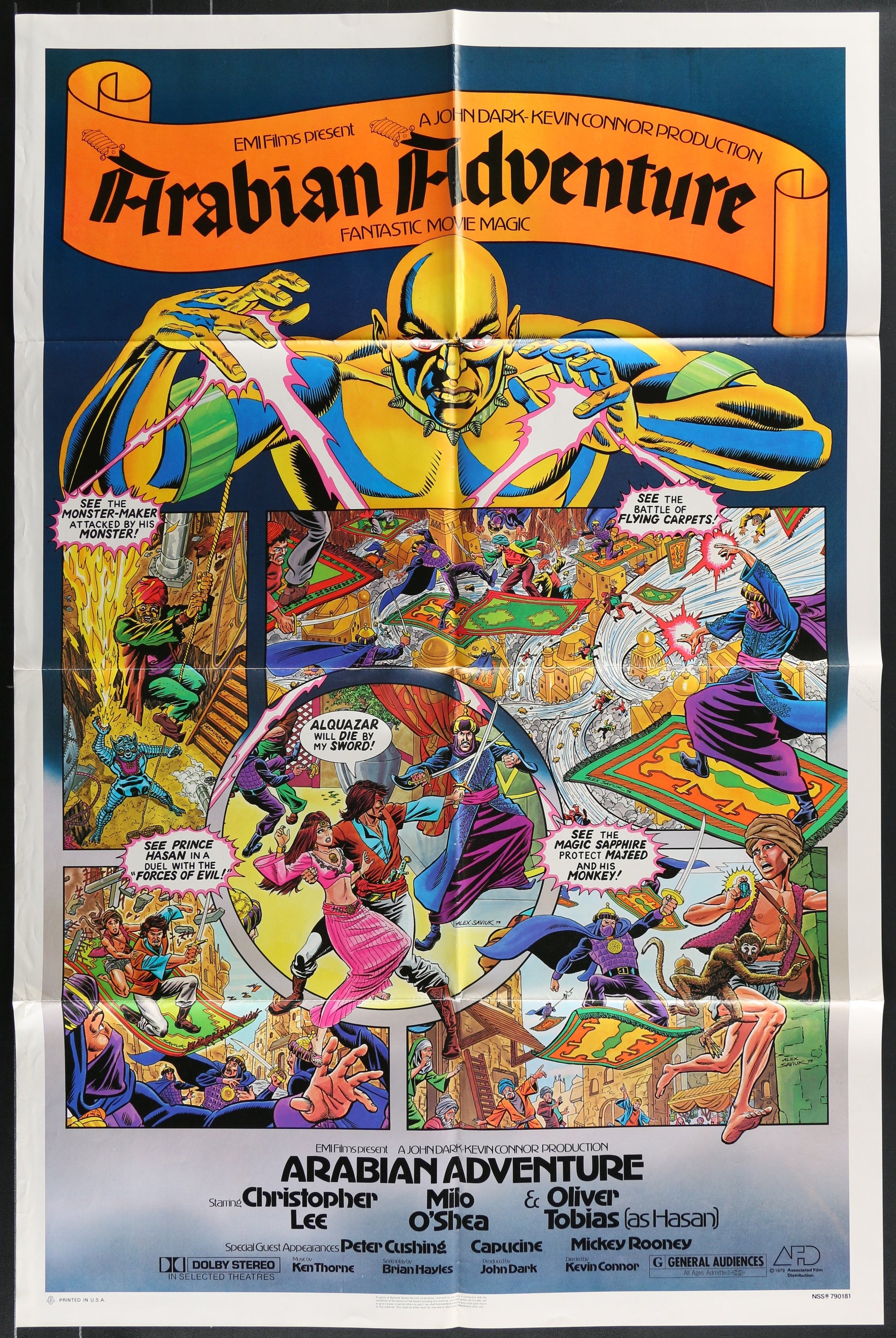 This original folded one-sheet movie poster measures 27" x 41" (69 x 104 cm) and is for Arabian Adventure, the 1979 fantasy adventure thriller directed by Kevin Connor, featuring Christopher Lee, Milo O'Shea, and Oliver Tobias. The poster displays edge and fold wear.