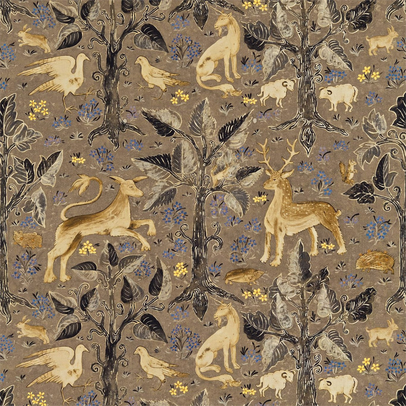 A scenic fabric depicting a forest scene richly studded with clusters of small flowers. Amongst the trees are rabbits, hedgehogs, horned sheep, squirrels, wild fowl, moles, deer and a handsome unicorn. A mid-15th century forest design, discovered in a house in Halifax in 1901, the design is printed on luxurious velvet in two colourways and on linen in two colourways and is reminiscent of tapestries found all over Britain..