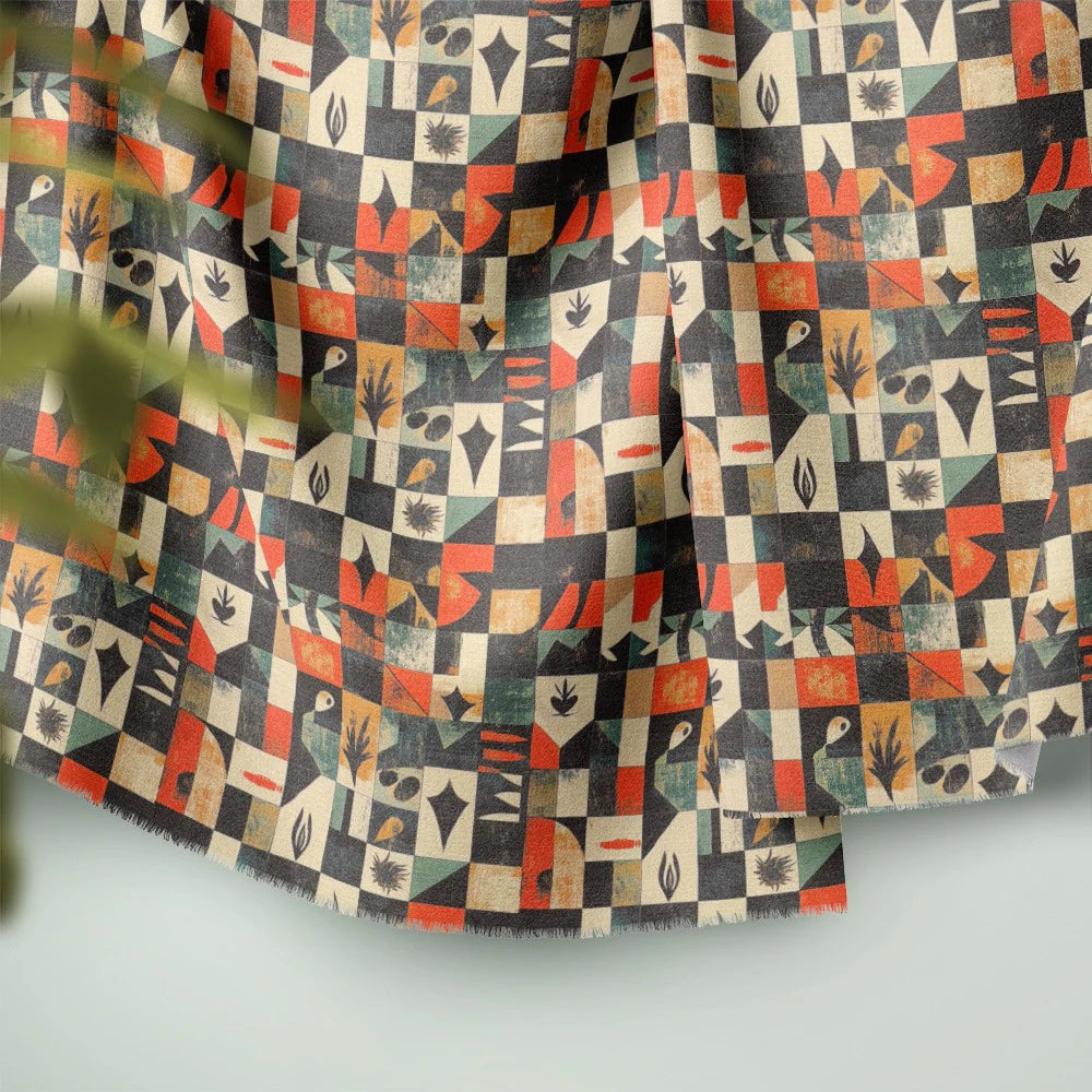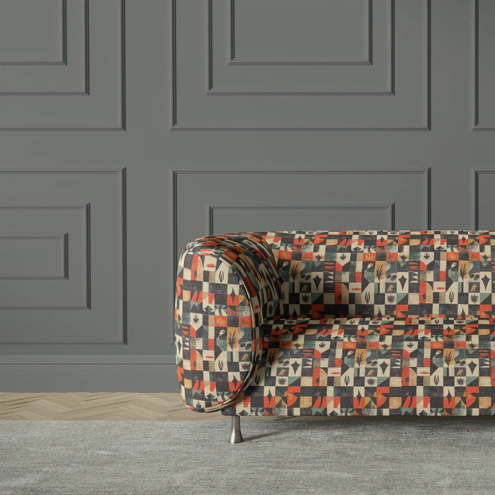 Atelier No.11 Upholstery Fabric is a celebration of eclectic form and movement — a bold visual language inspired by the expressive freedom of the modernist artist’s studio. This intricate composition features abstract motifs arranged in a structured tile layout, where muted creams meet deep navy and burnt orange, creating a design that feels both spontaneous and curated.