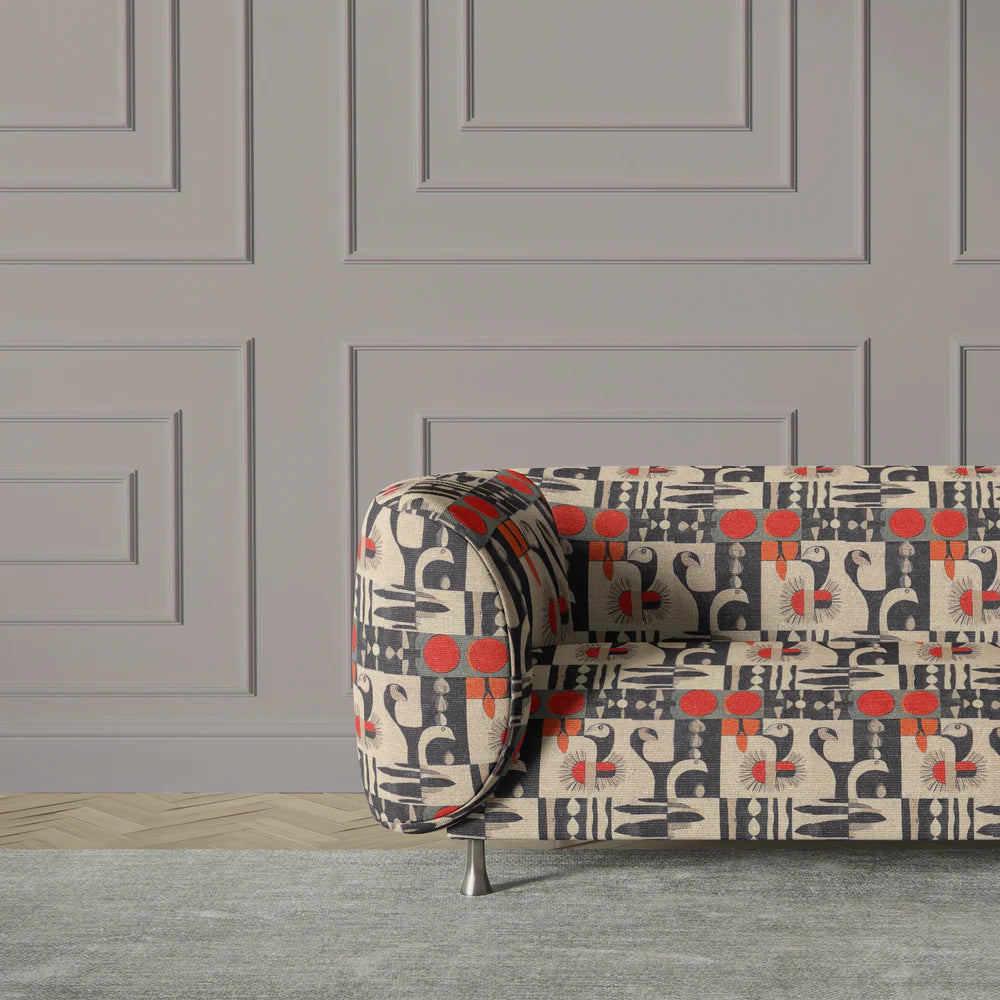Atelier No.12 Upholstery Fabric captures the visual rhythm of Bauhaus and Mid-Century art, presenting a mesmerising composition of mirrored bird motifs and geometric precision. With bold red circles, stylised eyes, and interlocking patterns, this textile channels a sense of structure, symbolism, and movement – all essential to the artistic atelier spirit.