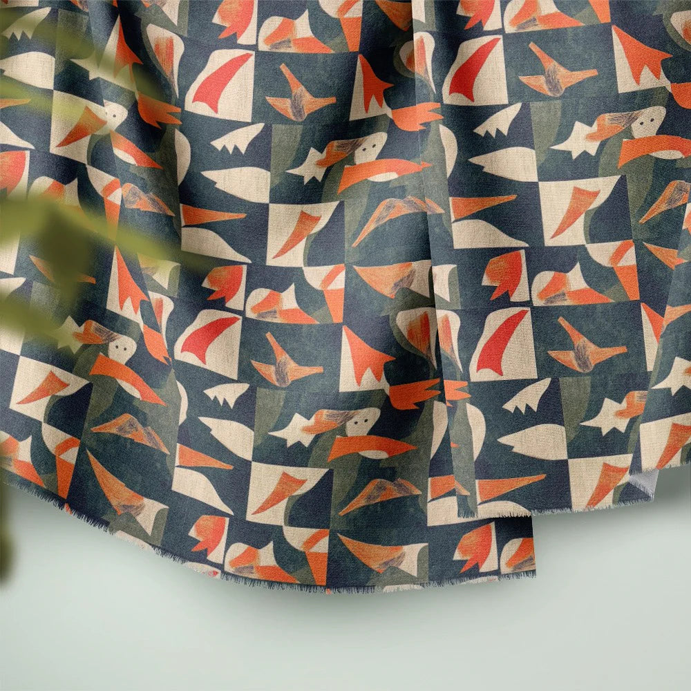Atelier No.13 Upholstery Fabric captures the rhythm and freedom of modernist art studios, blending mid-century geometry with the spontaneity of abstract expression. Hand-rendered motifs — resembling fluttering forms and soft angles — flow across a backdrop of deep charcoal, ivory, and earthy terracotta, making this fabric an inspired choice for design-led interiors.