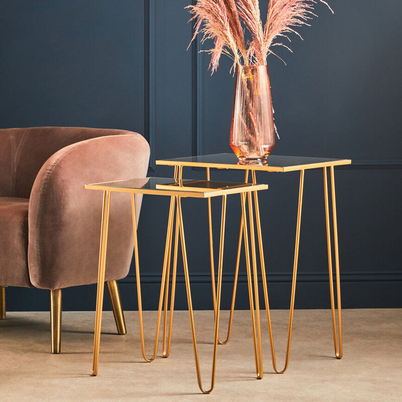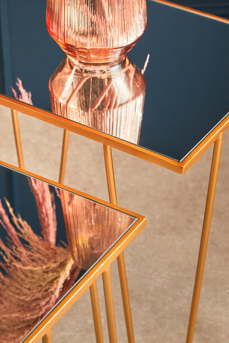 Sleek and versatile, the Avantis Set of 2 Rectangular Side Tables pairs gold hairpin legs with mirrored glass tops to deliver an elevated yet easygoing look. These gold rectangular end tables bring crisp geometry to living rooms and bedrooms, reflecting ambient light to brighten corners and visually enlarge compact spaces.