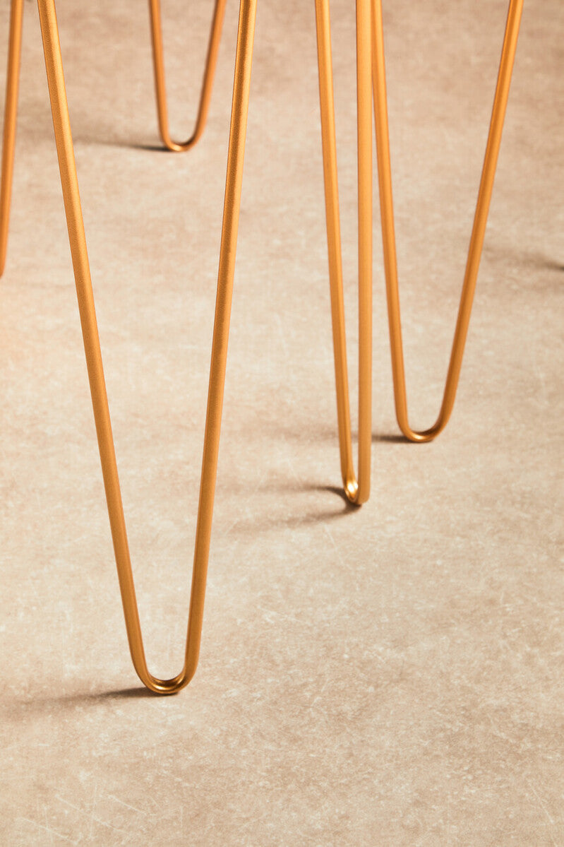 The hairpin bases provide a strong, stable stance while maintaining a light, open presence ideal next to low sofas or contemporary accent chairs.