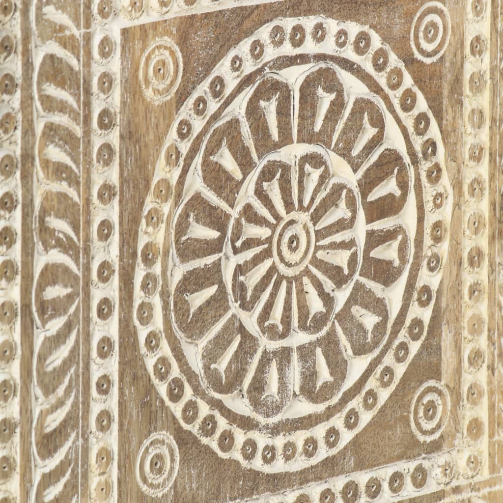 Solid mango wood is a tropical hardwood. It on the one hand has the strength to bear the weight, and on the other hand stands the wear and tear of time. Additionally, the exquisite craftsmanship and beautiful wood grains make every piece of couch tables slightly different from the next. The side table is equipped with 1 shelf and 2 compartments, providing ample storage room for displaying or keeping any items you'd like well organised. What's more, the whitewashed carved pattern adds to its beauty.