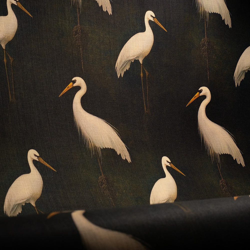 Aviary No.1 is a quietly majestic fabric that captures the elegance of white herons poised against a deep, forest-green ground. The design is both naturalistic and stylised — an ode to vintage bird illustrations, reimagined with Saint and Poet’s signature painterly touch.