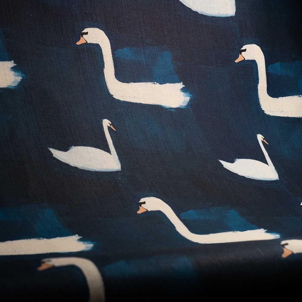 Aviary No.5 is a painterly celebration of swans in motion — a modern take on classic avian imagery. Broad, expressive brushstrokes bring texture and freedom to this fabric, where white silhouettes of swans glide across layered shades of deep indigo and ultramarine blue.