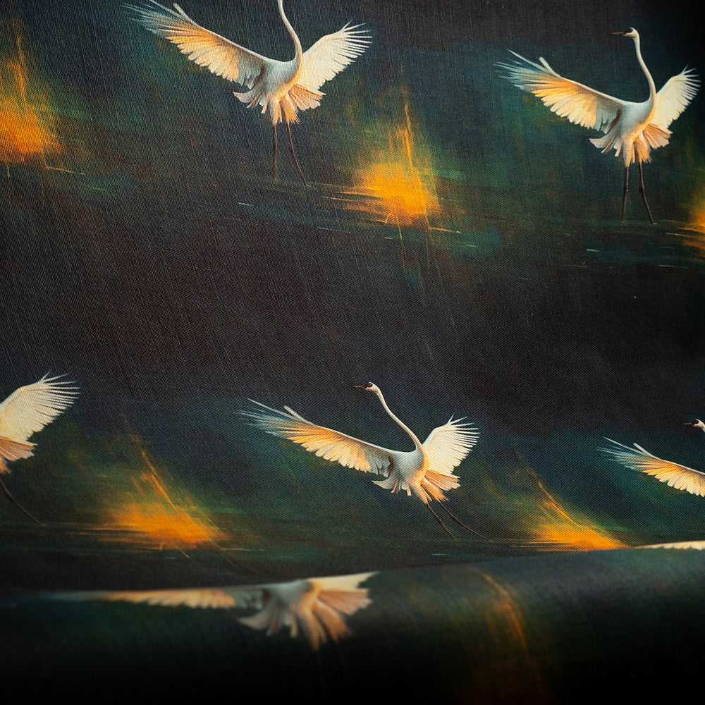 Aviary No.6 is a luminous and expressive upholstery fabric that captures the moment of flight through the lens of a classic oil painting. Graceful white cranes stretch their wings across a moody green and ochre sky, illuminated by the soft glow of painterly sunbursts that ripple through the scene like light on water.