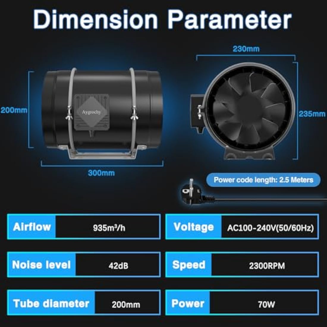 • 【Parameters 】DUCT DIAMETER: 8”(200mm) — Airflow: 550 CFM —Power: 70W —Noise: 42 dBA —Pressure: 768 Pa —IP44 Rating