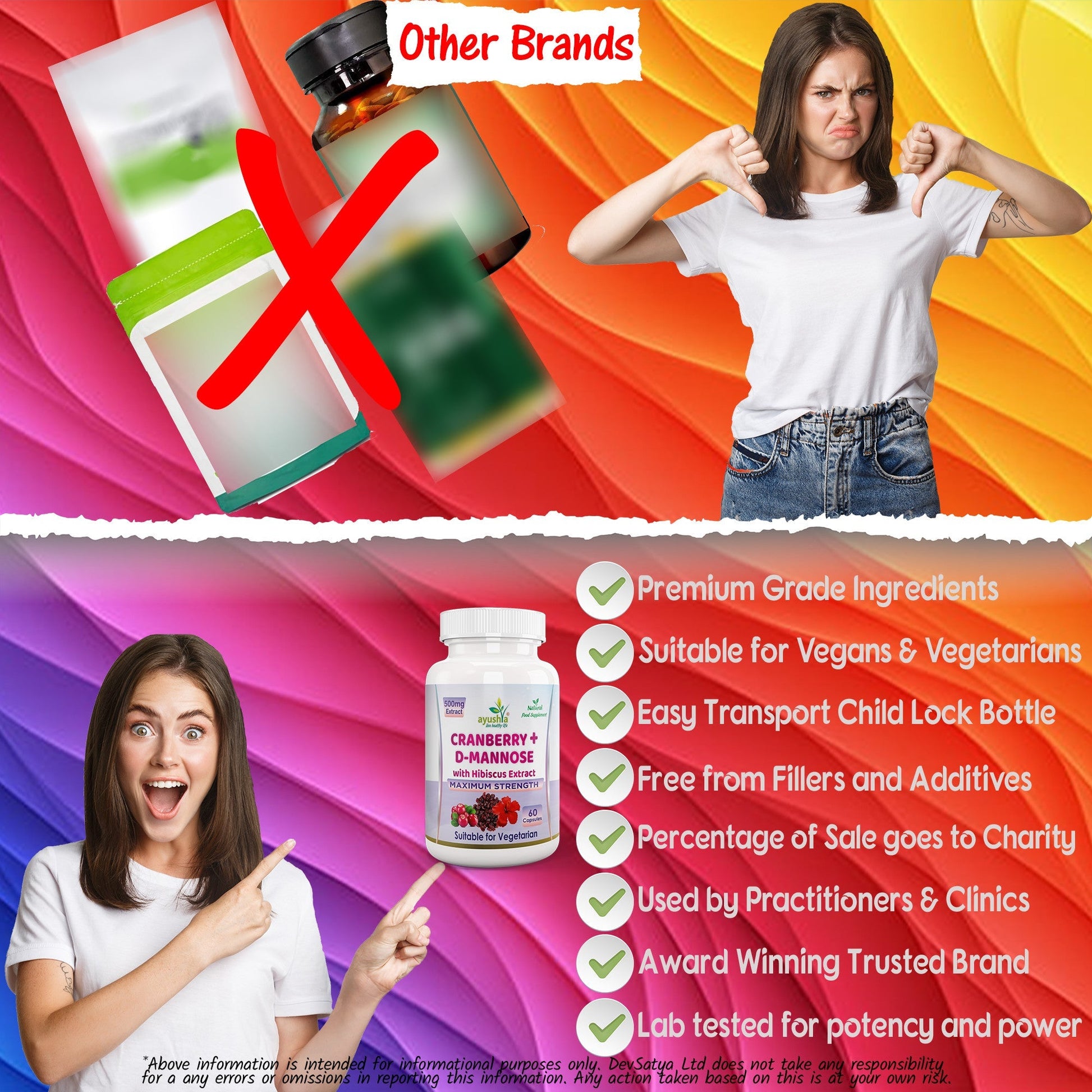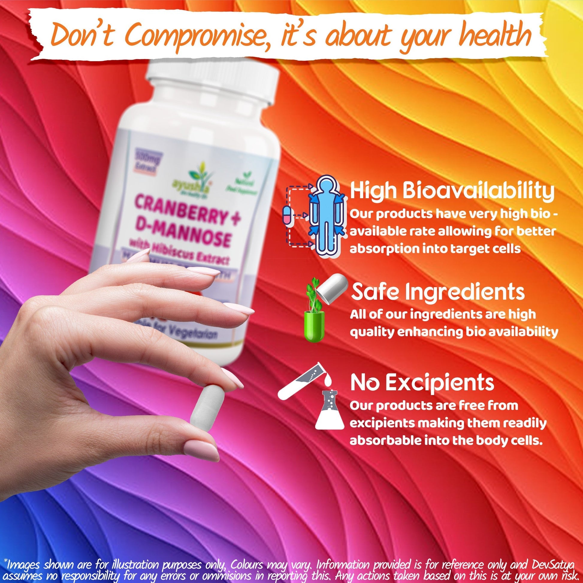 Ayushya Cranberry D-Mannose with Hibiscus Capsules Urinary UTI Bladder Wellness Support Cystitis - Vegan, Gluten Free, Non-GMO, 60 Capsules
