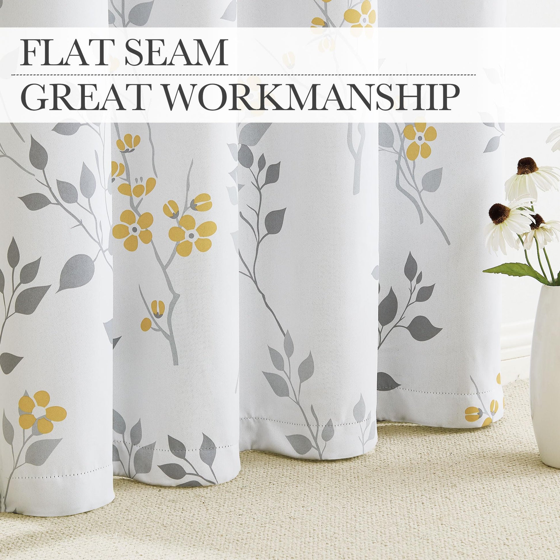 Beauoop Yellow Grey Floral Blackout Curtains for Bedroom Living Room 72 Inch Drop Leaf Print Eyelet Curtain Botanical Thermal Insulated Noise Reducing Drapes Window Treatment Sets 2 Panels