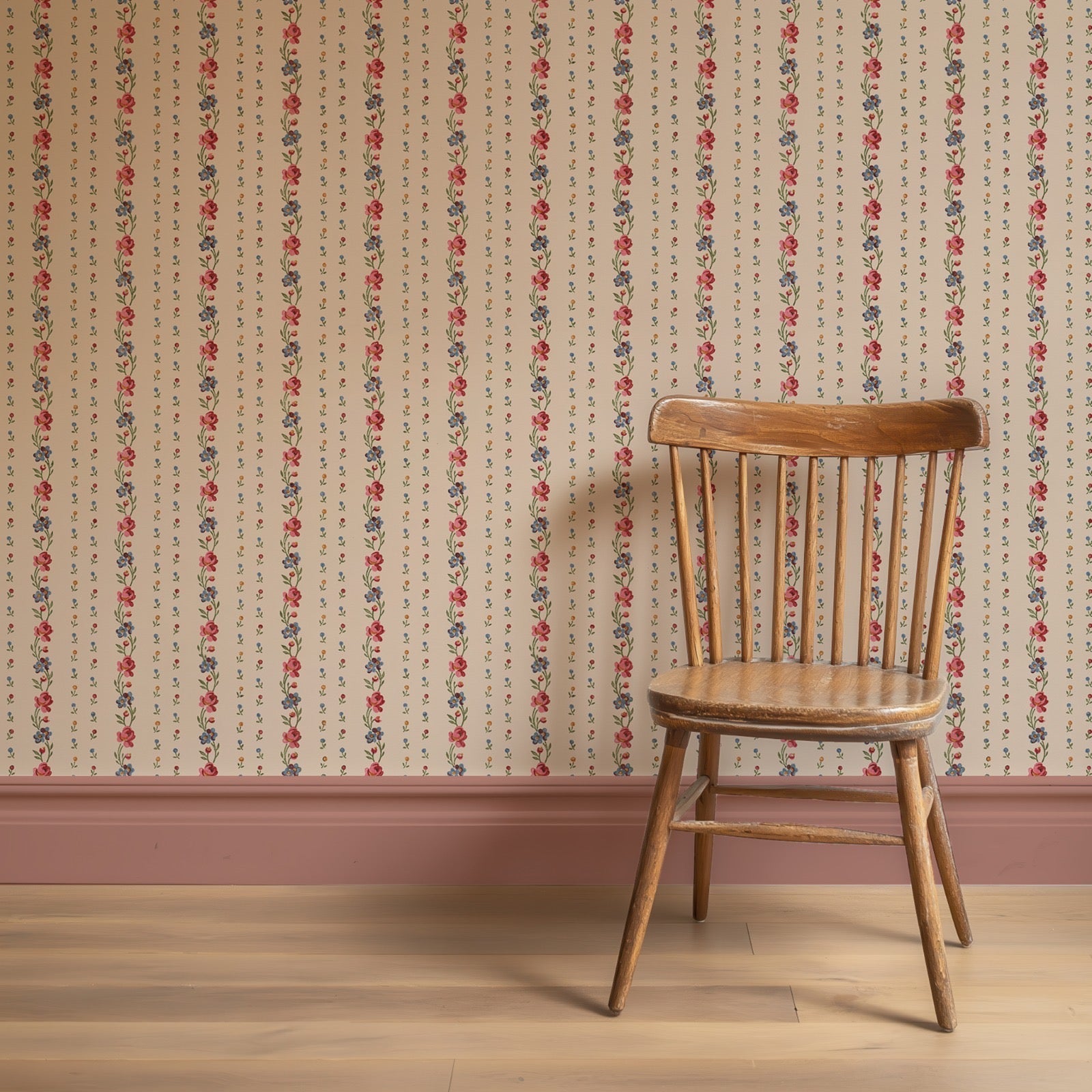 The pattern features elegant vertical garlands composed of roses, forget-me-nots, and scattered floral buds, arranged in a rhythmic ascent. This structure reflects the influence of early Empire and Romantic interior design, which emphasized harmony and decorative order, particularly in Parisian salons and provincial châteaux.