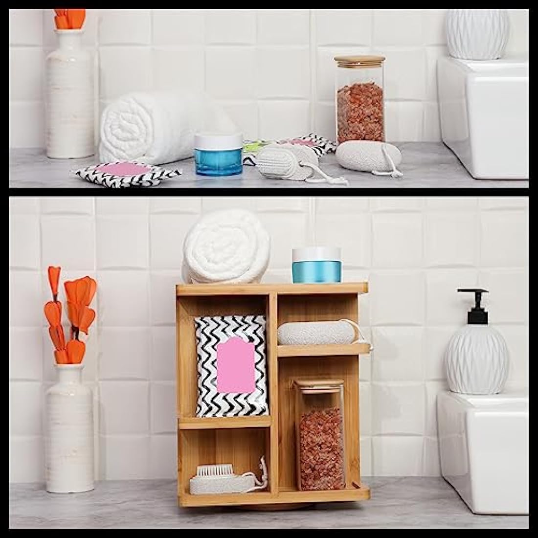 8 COMPARTMENT UNIT: This bamboo storage turntable helps reduce clutter around your home, giving you easy access to your essential cosmetic items. The full storage rack measures W25 x D18 x H30cm (9.84 x 7.09 x 11.81 inches). There are 8 different-sized compartment shelves that each have a slight lip, preventing your items from falling out. There are also 3 holes at the top to hold brushes, lipstick or eyeliners. For the dimensions of each compartment, please refer to image 2.