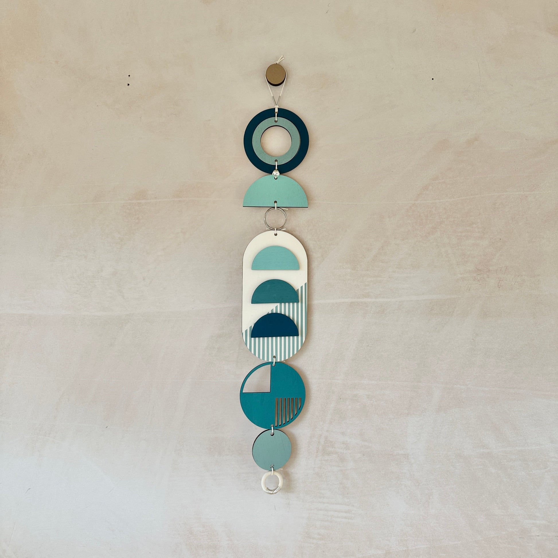 Lovingly handmade modern wall art. These pieces are made from plywood, paint, metal and waxed cord. The colours used are beautiful blues with silver components. These slim wall hangings would make a beautiful addition to any room to create a modern mid-century feel. Made from sustainable plywood, hand painted and constructed in Milton Keynes, England.