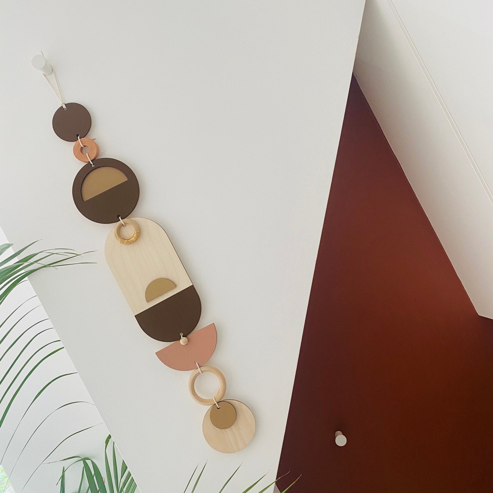 Lovingly handmade modern wall art. This Piece is made from plywood, paint, metal, waxed cord and wooden beads. The colours used are browns. This slim wall hanging would make a beautiful addition to any room to create a modern mid-century feel. Made from sustainable plywood, hand painted and constructed in Milton Keynes, England.