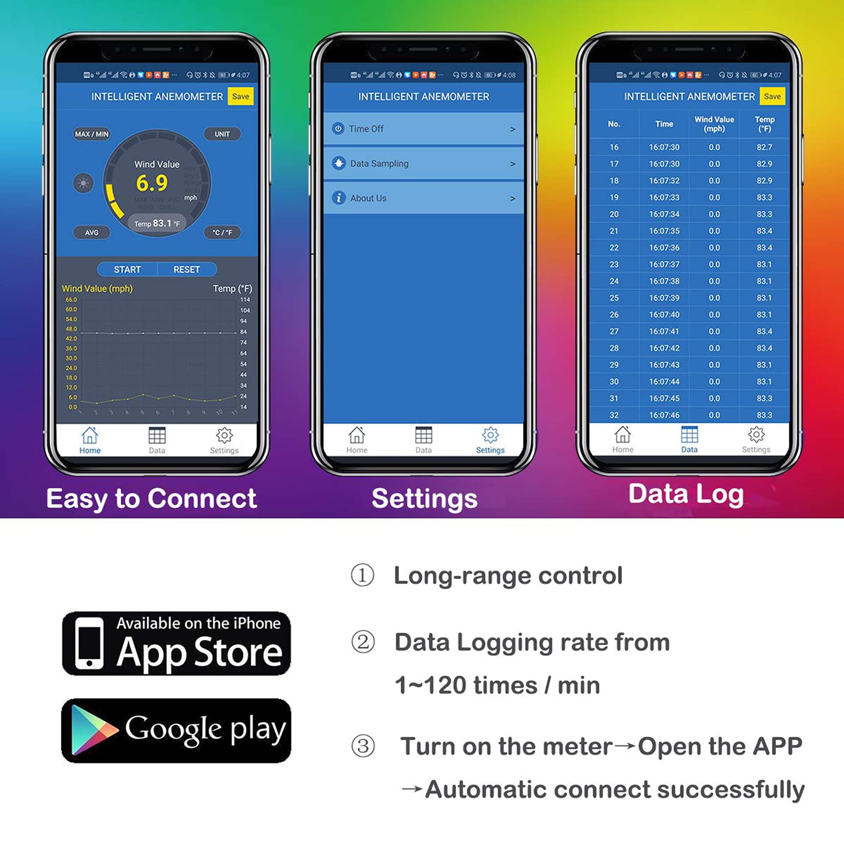• 【Wireless Bluetooth Anemometer】BT-100 Anemometer can auto pair with your iphone, ipad ,android phone and tablet via bluetooth APP. A 1/4’’metal hole in the bottom is for you to fix the meter on a tripod for continuously testing, it can also log the data and export in excel,txt. It’s the ideal wind velocity gauge for weather station, sailing, long distance shooting.