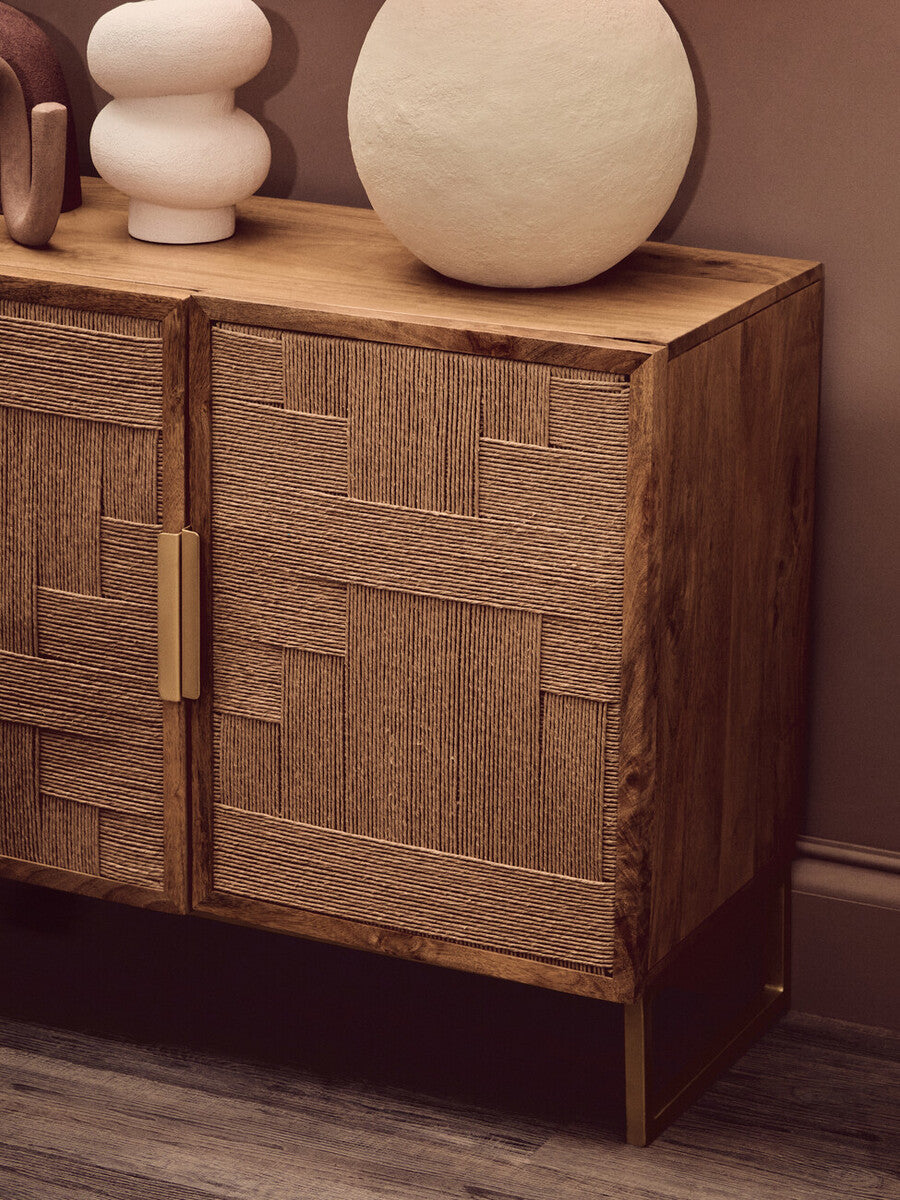 Centre the Carta Natural Papier Mache Table Lamp With Rust Raffia Shade on a sideboard with a round mirror above to create a welcoming focal point. On a desk, it softens the look of metal and glass while providing gentle task lighting. Pair with terracotta pots or caramel-toned cushions to echo the shade and complete a cohesive palette.