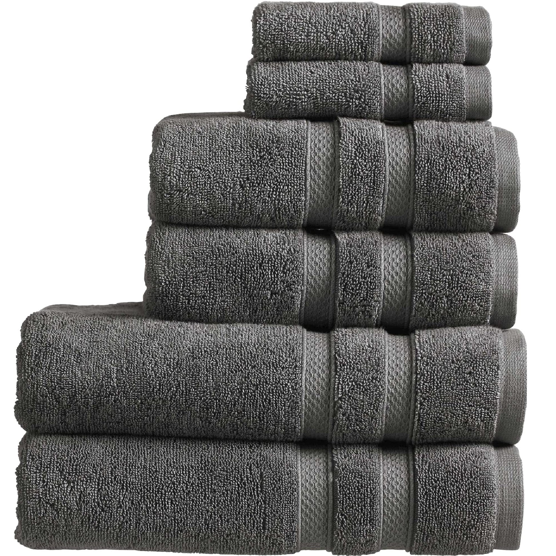 • HIGHLY ABSORBENT - these heavyweight towels are 675GSM, which makes them highly absorbent. This 6 piece set contains 2 large bath towels (125cm x 70cm), 2 hand towels (90cm x 50cm), and 2 face cloths (30cm x 30cm).
