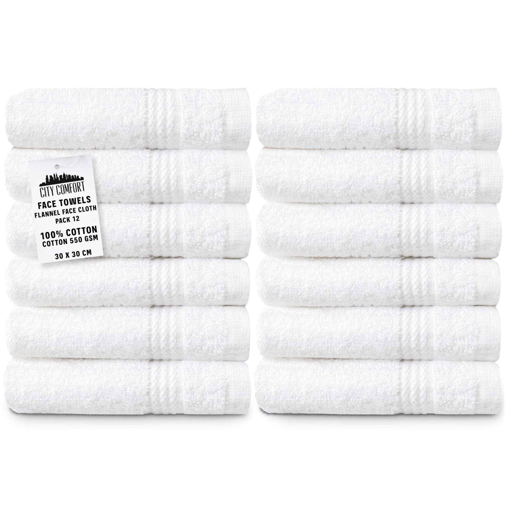 CityComfort Flannels Pack of 12 Face Towels 100% Cotton 550 GSM 30x30cm Highly Absorbent Soft Wash Cloth Household Essentials (White - 12 Pack)