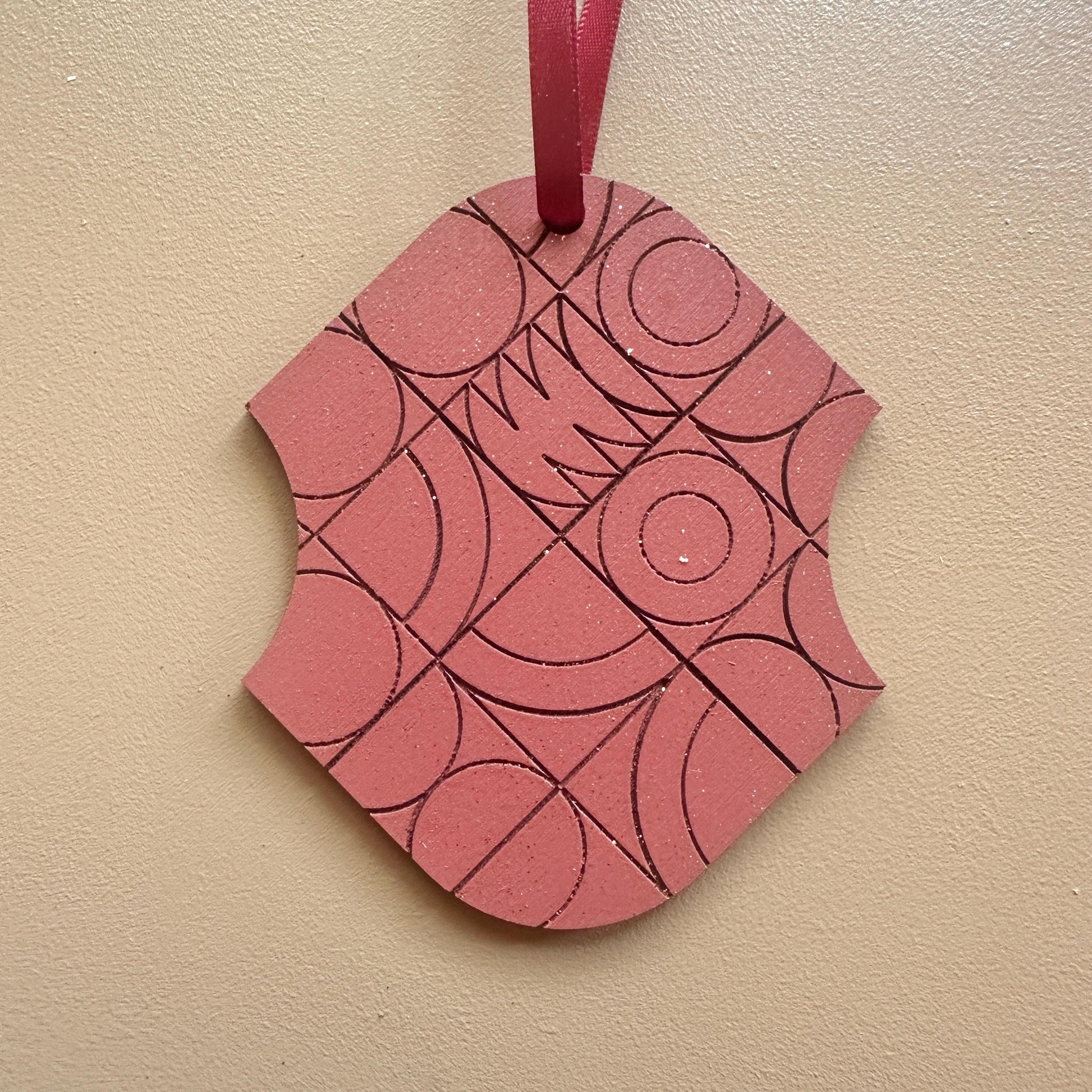 • Wooden ornament with laser etched geometric design on one side.
