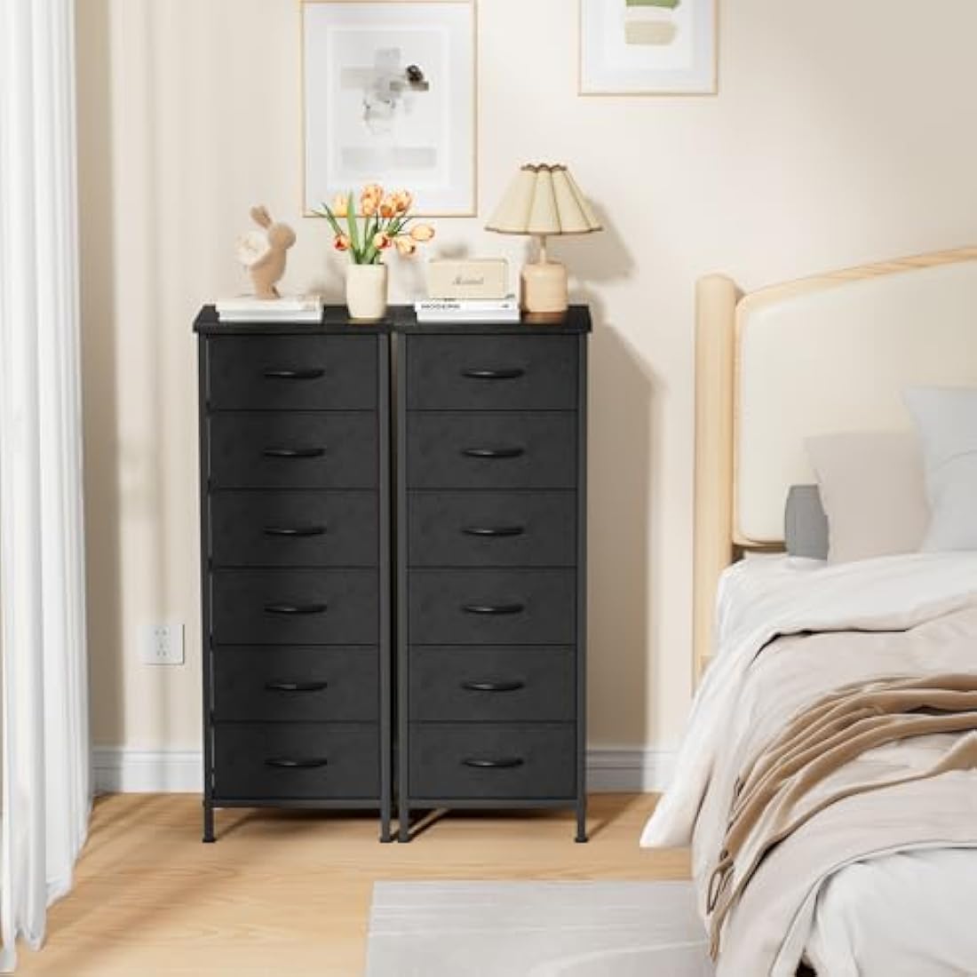COWISH Tall Dresser with 6 Drawers, Vertical Bedside End Table and Chest of Drawers for Bedroom, Black Furniture with Fabric Drawer Nightstand Organizer Unit in Living Room, Closet, Entryway, Hallyway