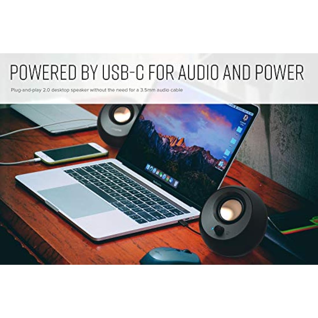 SIMPLE, PLUG-AND-PLAY USB-C 2.0 SPEAKER | Creative Pebble V3 supports fuss-free connectivity and minimal cabling with only a single USB-C cable and without the need for a 3.5 mm audio cable so your desk remains neat and clutter-free from messy wiring. When used with the latest USB-C ports found on newer computers, the Pebble V3 can draw power more efficiently for louder USB audio. For older computers with a USB-A port, we've also included a USB-Cto USB-A converter for your convenience