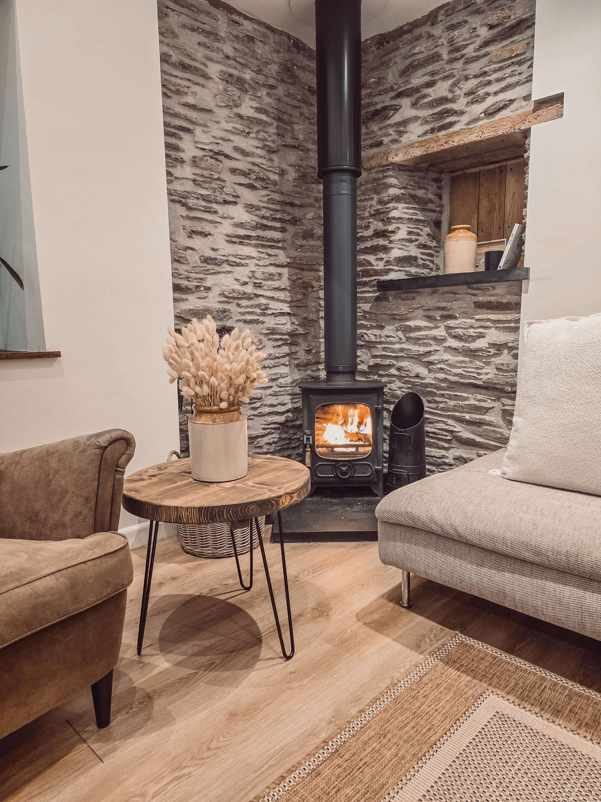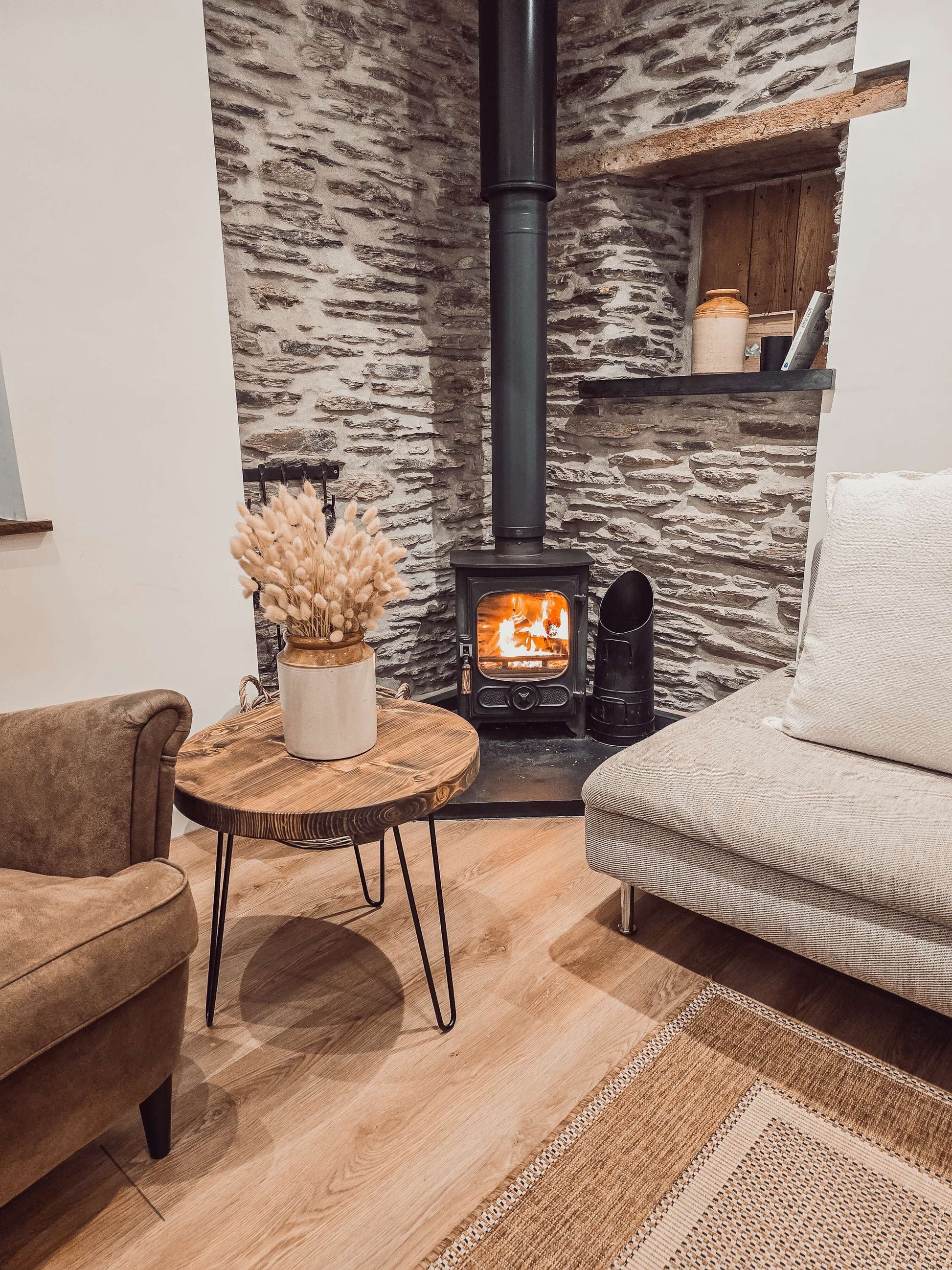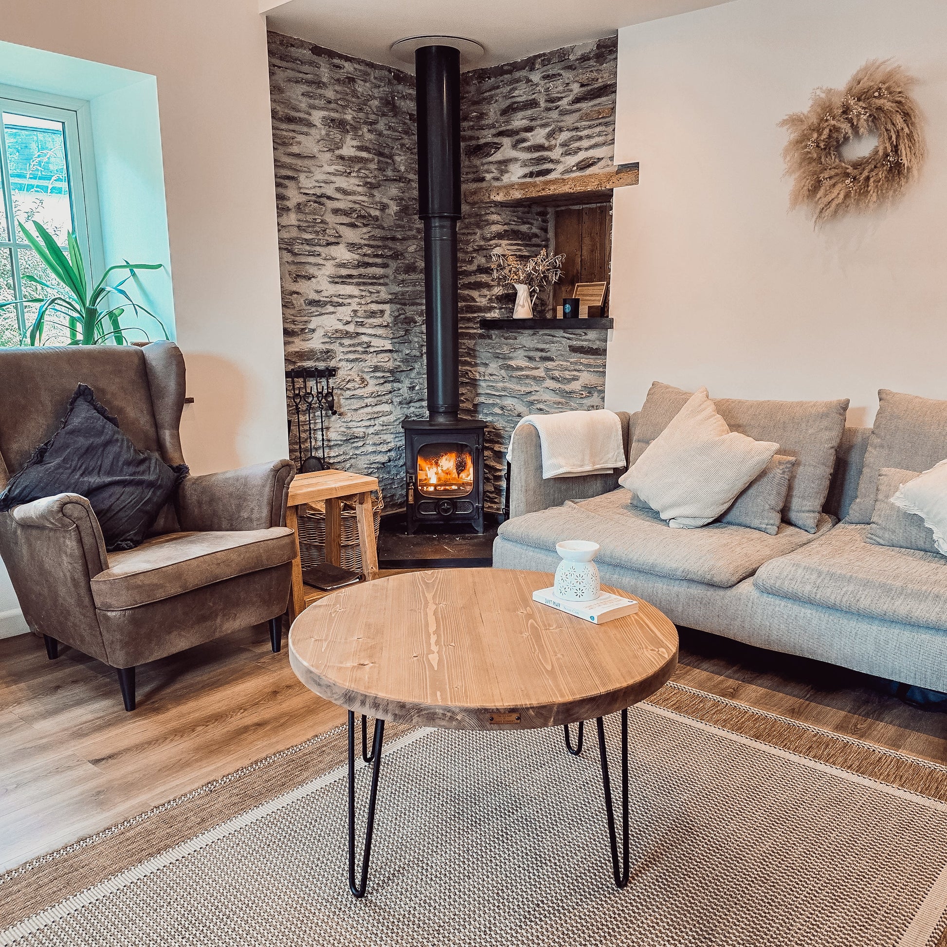 DALVA Rustic Chunky Round Coffee Table with 3 Black Hairpin Legs