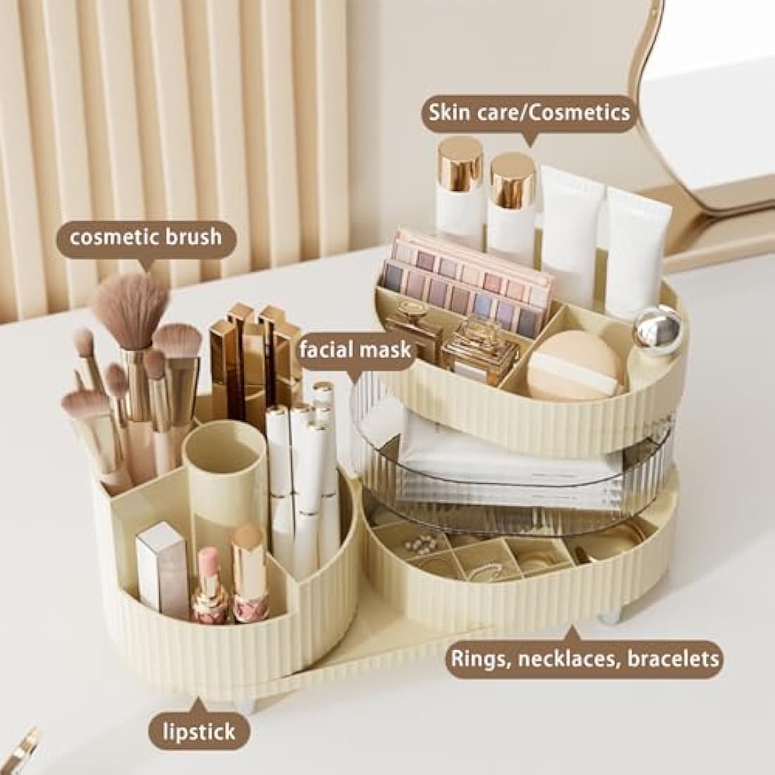2.Large Capacity:Our newly designed makeup storage organizer has partitioned storage function, which allows you to neatly arrange and classify items. On the left side is a 360° Rotating Makeup Brush Holder Organizer, which can hold makeup brushes, lipstick, eyeliner, etc. On the right side is a divided cosmetics storage box, which can be used to store perfume, foundation, lotion and other items. In addition, there are large drawers for storing facial masks and jewelry items.