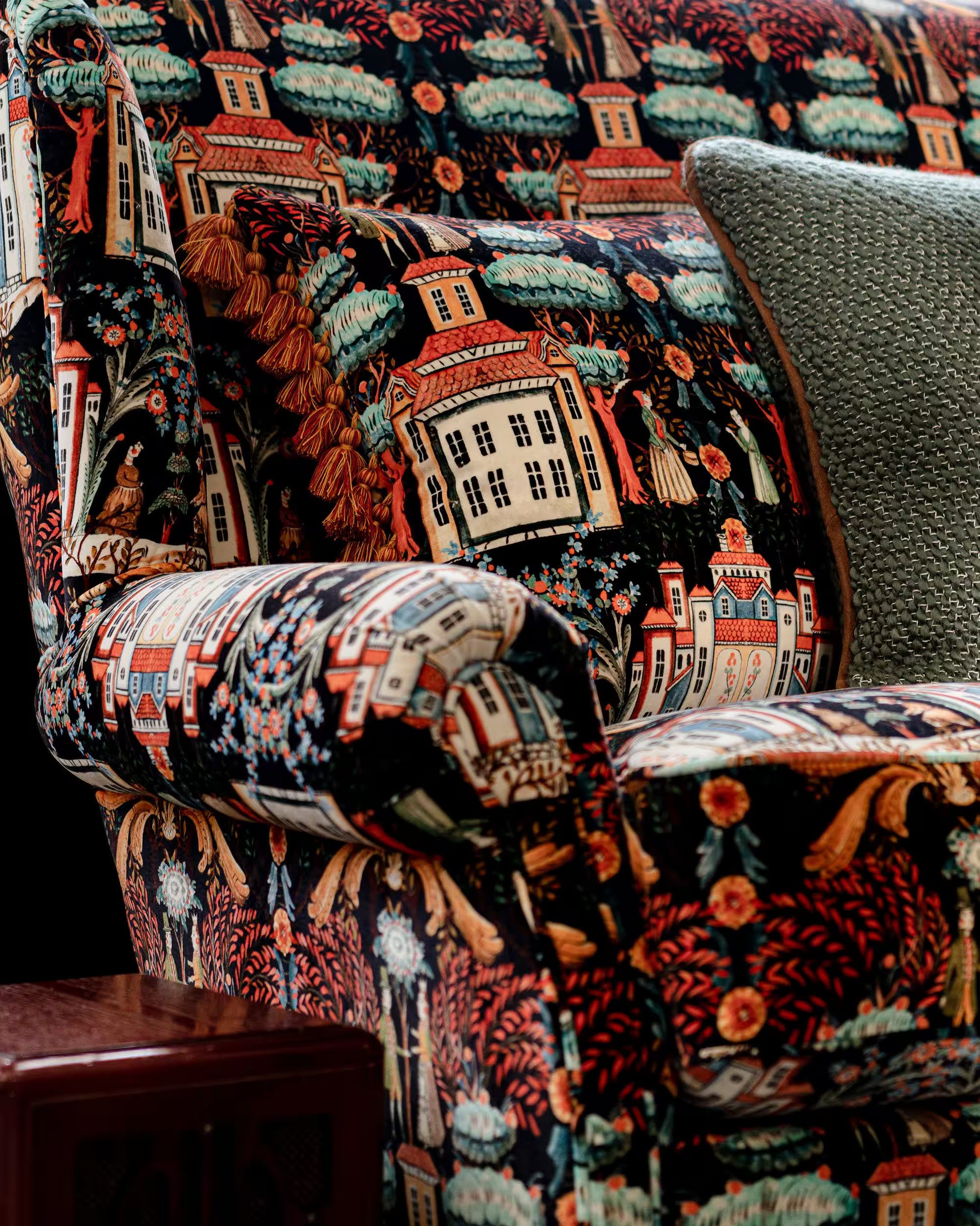 Step into a world of wonder with TALES OF TYROL, a magical design where Tyrolean architecture and village folk come together under a canopy of fantastical foliage. Rosy cheeked in their traditional costumes, these charming characters inhabit an imaginary town surrounded by trees and flowers in a host of jewel-like shades.
