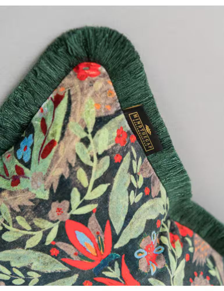 Lustrous velvet forms the base of this regal cushion, which is sewn from the exotic DER KÖNIG cotton fabric. Edged in opulent green fringing, the crimson and black design features majestic stags camouflaged against folk-inspired flowers and leaves.