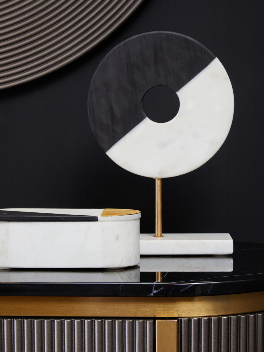 A dark marble top crowns the design, offering a sophisticated surface for vases, bowls, and statement lighting. The black, wood-effect body features elegant fluting that catches the light, while gold-tone borders and legs complete the modern profile.
