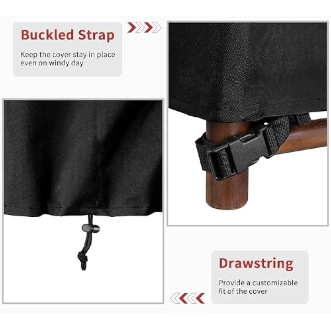 FULLY FIXED, NEVER BLOWN AWAY - There is 4 buckled straps at the bottom. Which was special designed to keep the cover secure on the furniture, so that it will not be blown away by wind. Adjustable drawstrings provide a customizable fit of the cover