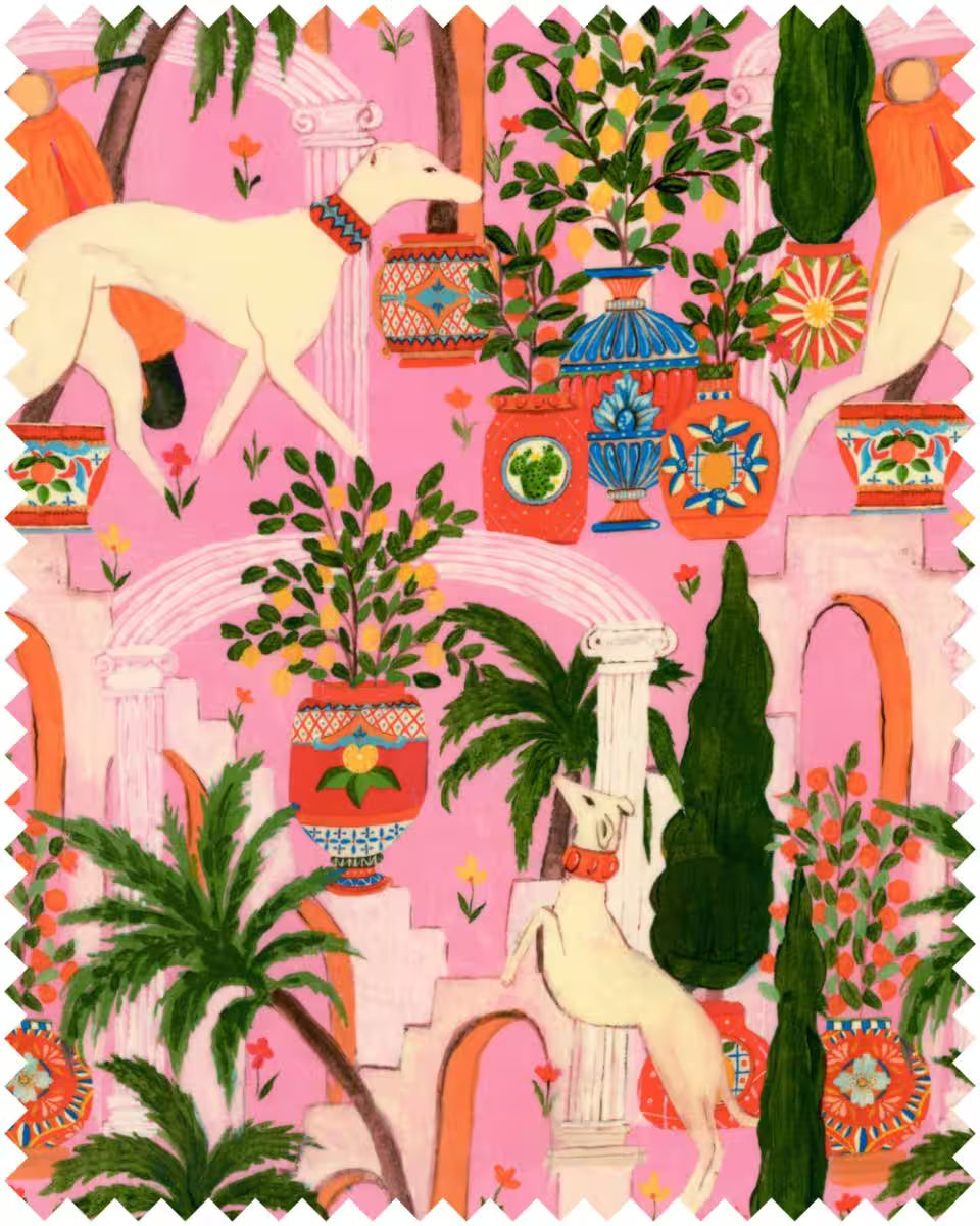 In the heart of an Italian palace, where the whispers of history mingle with the scent of blooming flowers, lies LA DOLCE VITA. At the center of this heavyweight velvet fabric stand two regal dogs, their graceful forms and noble demeanor serving as a testament to the grandeur of Italian aristocracy. Adorned with gilded collars and jeweled accessories, they exude an air of aristocratic charm, as if they were the guardians of a bygone era. Majestic palm trees sway gently in the breeze, their fronds casting dappled shadows across the scene and adding a sense of tropical allure.