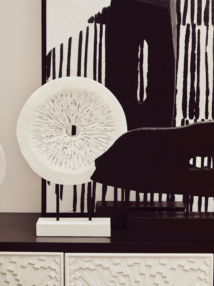 The black top offers an elegant stage for lighting and sculptures, while the white doors feature a subtle, tactile pattern finished with gold knobs. A slim gold base completes the look, lifting the body visually to keep rooms feeling open.
