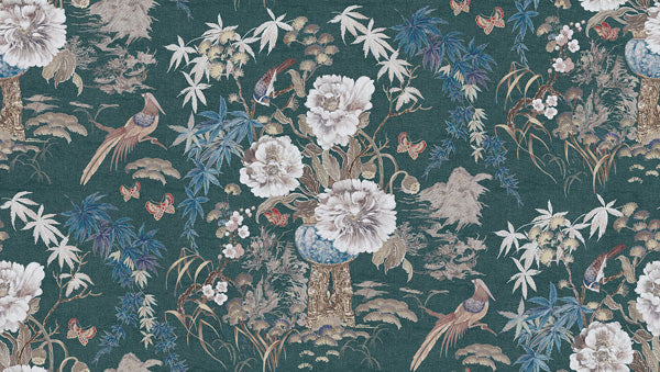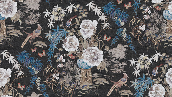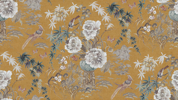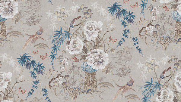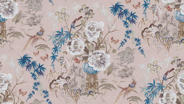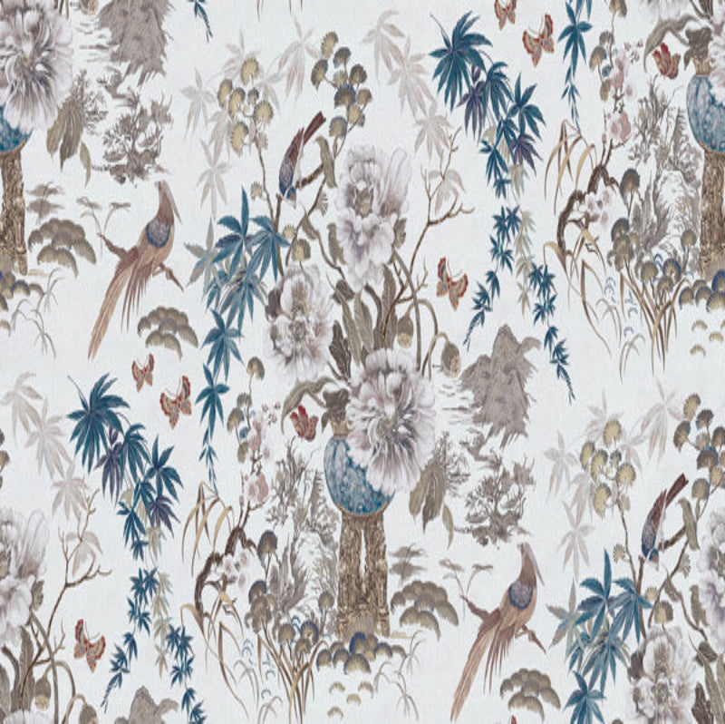 Diane Marsland "The Opium collection is a mix of East meets West . Using classic Chinoiserie motifs of birds, butterflies, blossoms, Oriental jardiniere and scenic background with a more western, French painterly floral.