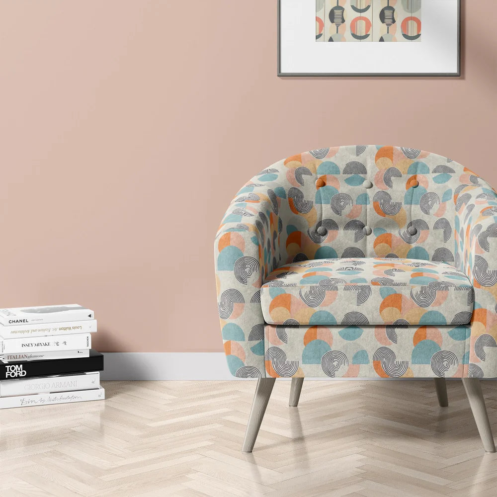 A joyful collision of curves, colour, and crisp geometry, Elements No.1 is a standout multicoloured upholstery fabric designed to bring a fresh energy to modern interiors. The pattern features a playful arrangement of semicircles, spirals, and blocks in sun-warmed orange, blush pink, aqua blue, and graphite—brought to life on a warm off-white ground. There’s a graphic rhythm to the layout that evokes both mid-century modernism and retro optimism, making it an ideal choice for contemporary statement pieces.