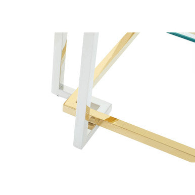 A clear tempered glass surface sets the stage for trays, magazines, and floral arrangements while maintaining a light, spacious feel. The stainless steel base forms an intersecting structure in silver and gold, adding gleam and a hint of art deco inspiration. The combination works with neutral upholstery and colourful cushions alike.