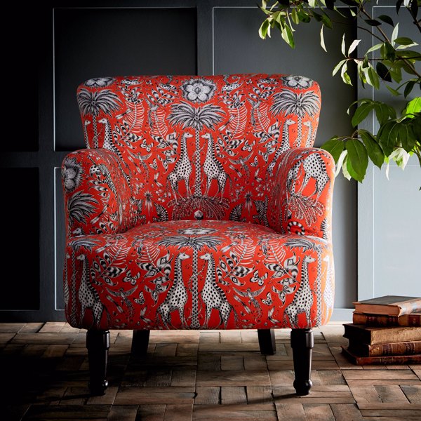 Intricate and striking winged lynx with peacocks' tails leap through a starry sky. This cosy armchair adorned with Lynx coral velvet is the perfect maximalist statement.