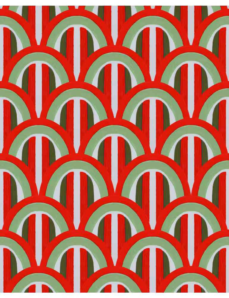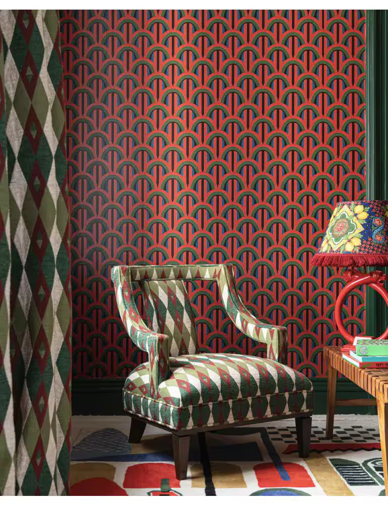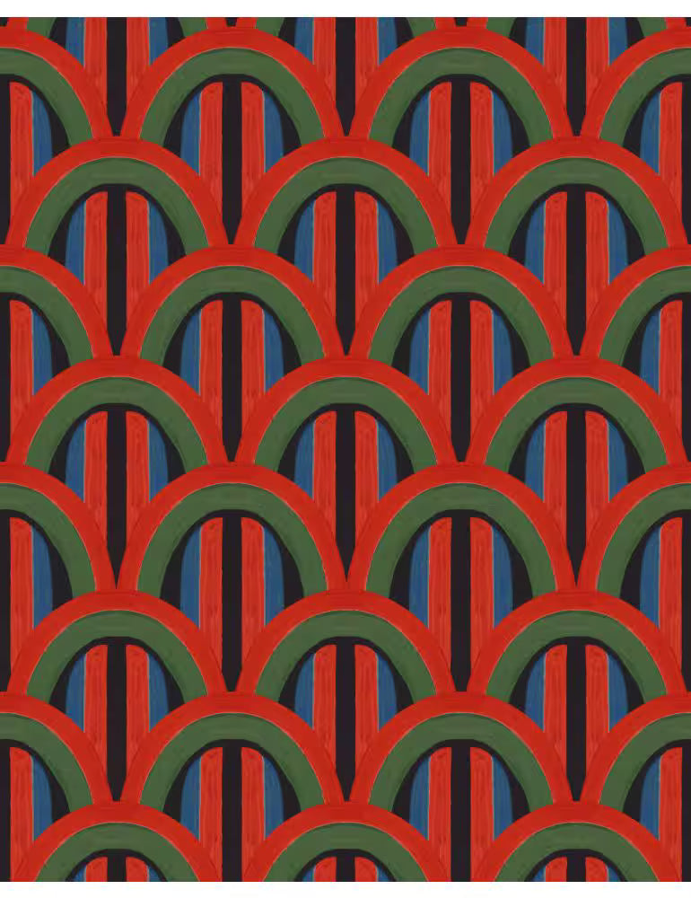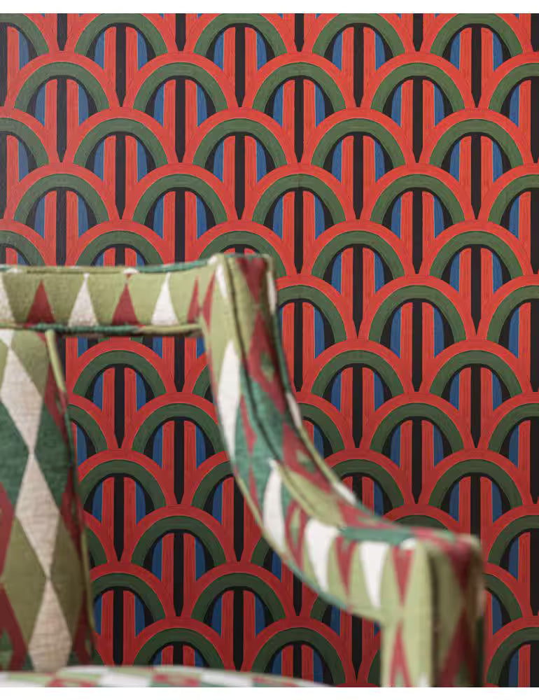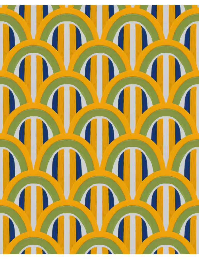 A captivating wallpaper infused with vibrant geometric patterns that are endlessly repreated, reminiscent of sparkling ocean waves. Here, relaxation is at its core, creating a cheerful ambiance that effortlessly elevates any space. Alongside these coastal-inspired motifs, ESTIVO also features an abstract pattern bringing back memories of childhood rainbows, set against a serene blue background in a trendy retro style.