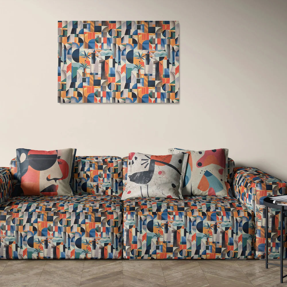 Exhibite No.16 Upholstery Fabric brings a fresh and exotic rhythm to modern interiors with its tropical modernist aesthetic. Abstract architectural blocks are softened by hand-drawn palm silhouettes and sunlit tones — creating a design that feels both playful and sophisticated. A refined palette of terracotta, ochre, navy, mint, and stone balances bold shapes with serene natural elements.