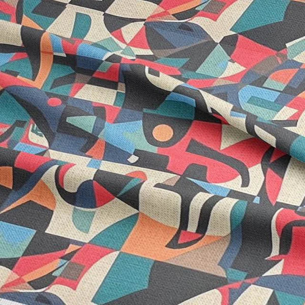 Exhibite No.5 Upholstery Fabric channels the energy of a curated gallery wall, brought to life through fragmented shapes, layered textures and muted jewel tones. Swathes of slate blue, rust, chalk white and peach form an abstract visual rhythm, grounded by soft geometry and painterly detail.